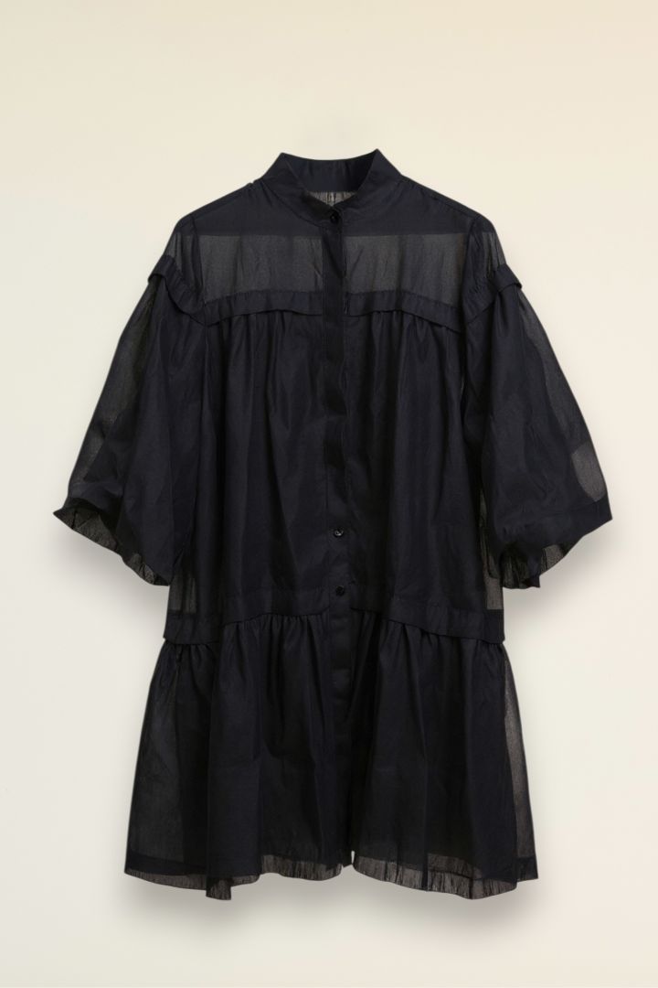 A bold black mini dress featuring soft tulle layers that create volume and movement. Designed with sheer puff sleeves and a cinched waist, it gives a dramatic yet playful silhouette. Perfect for evening outings or when you want to make a confident, fashion-forward statement.