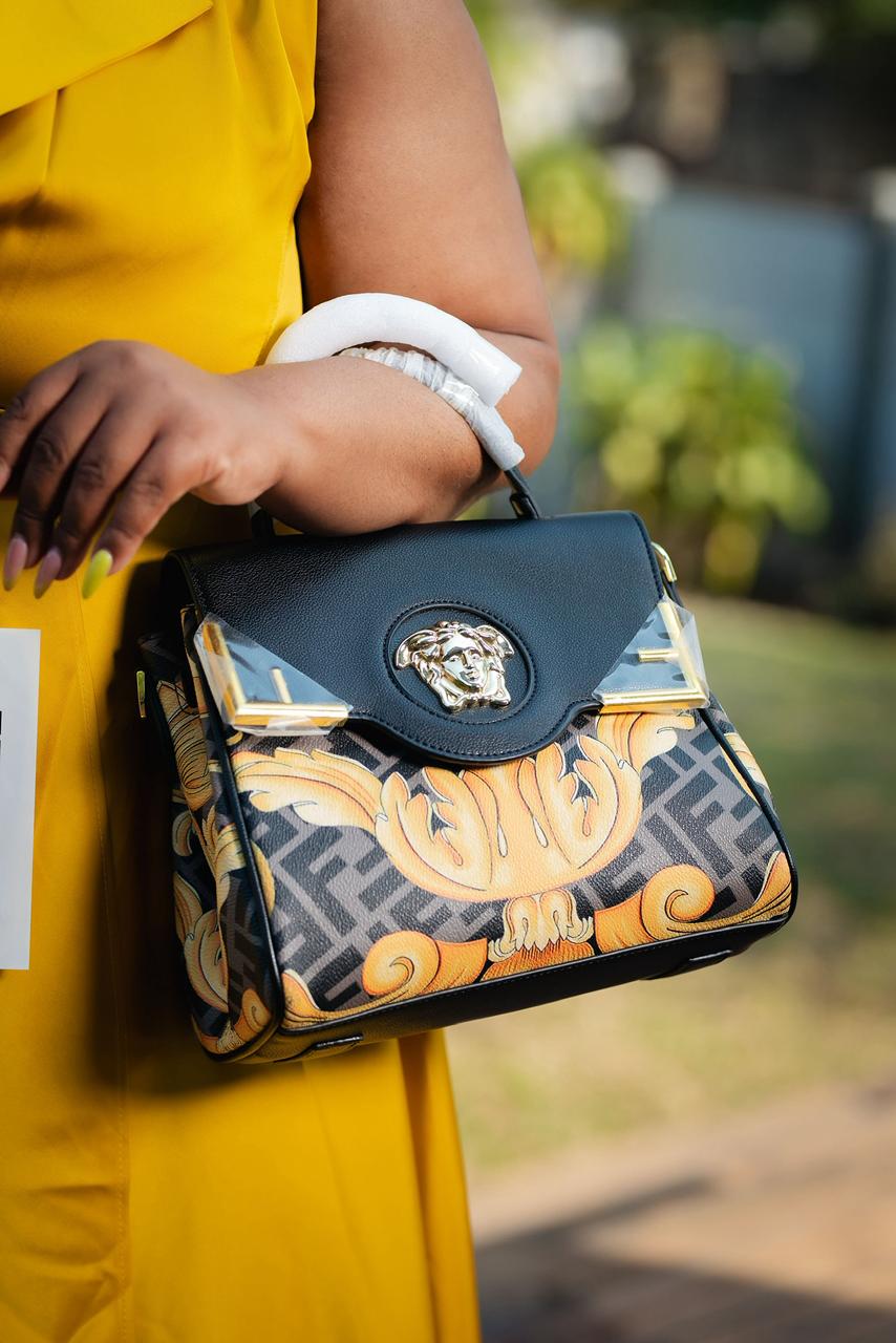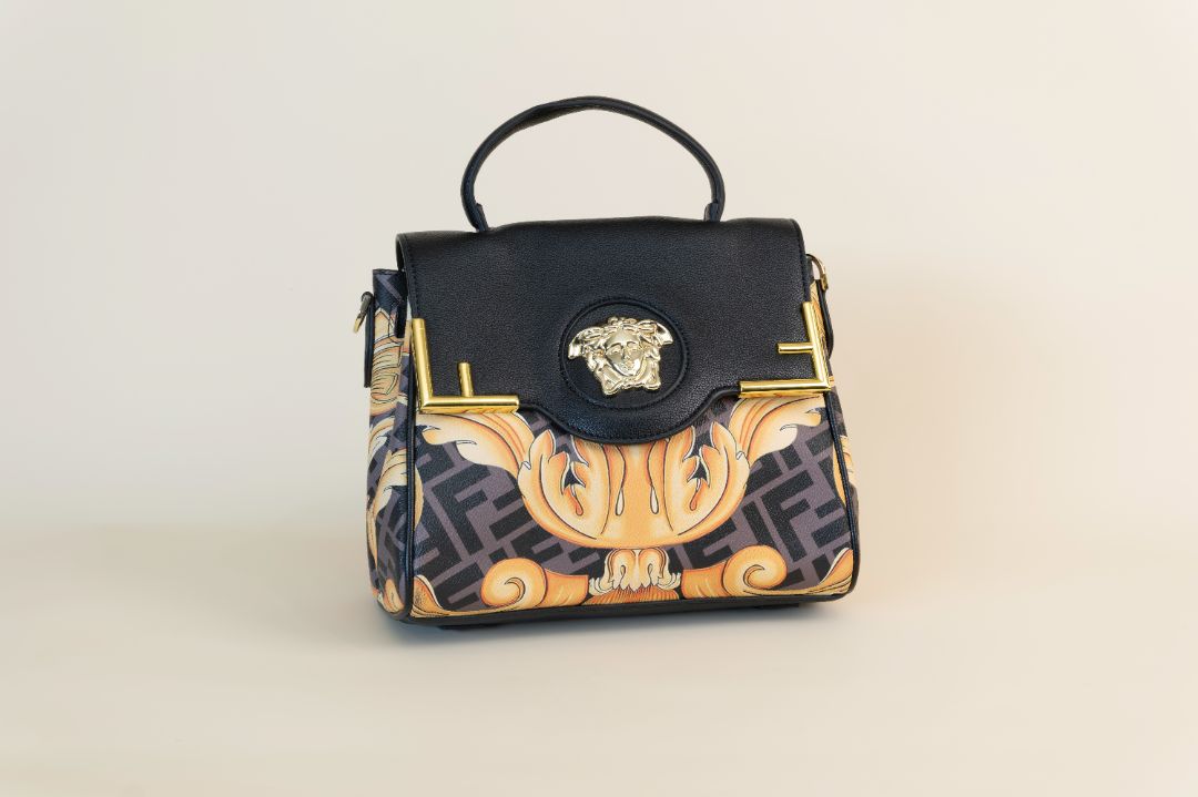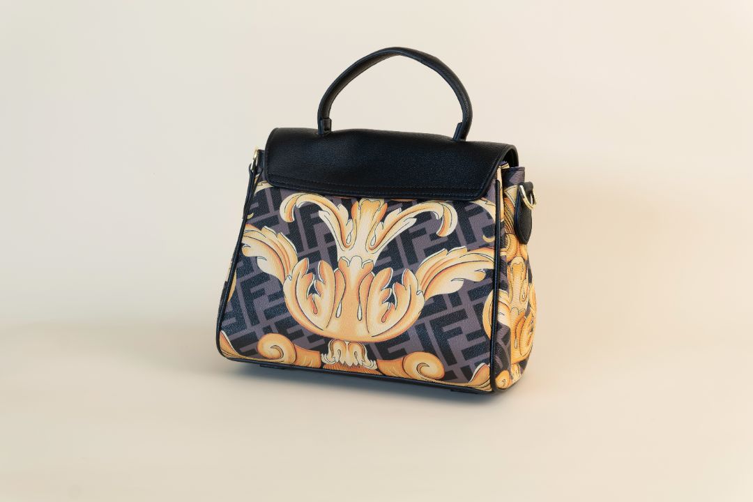 Elevate your ensemble with the golden black Luxe Noir Handbag, a masterpiece of style and sophistication. This elegant black handbag is adorned with subtle gold accents and a unique design that combines timeless elegance with modern flair. The handbag features a chic black and yellowish-gold palette, complemented by intricate golden stripes that add a touch of luxury. Its structured, cube shape provides both functionality and a bold statement. Perfect for any occasion, the Luxe Noir Handbag is your go-to for an effortlessly chic look that transcends time and trends.